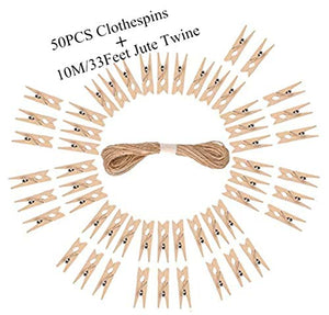 DurReus 50PCS 1.5inch Small Natural Wooden Clothespins for Pictures with Jute Twine Paper Peg Clips Photo Holders Hanging Crafts Home ...